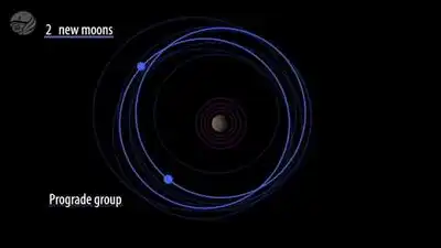 Two of the prograde moons are closer to the planet and take about two years to travel once around Saturn. The more-distant retrograde moons and one of the prograde moons each take more than three years to complete an orbit.