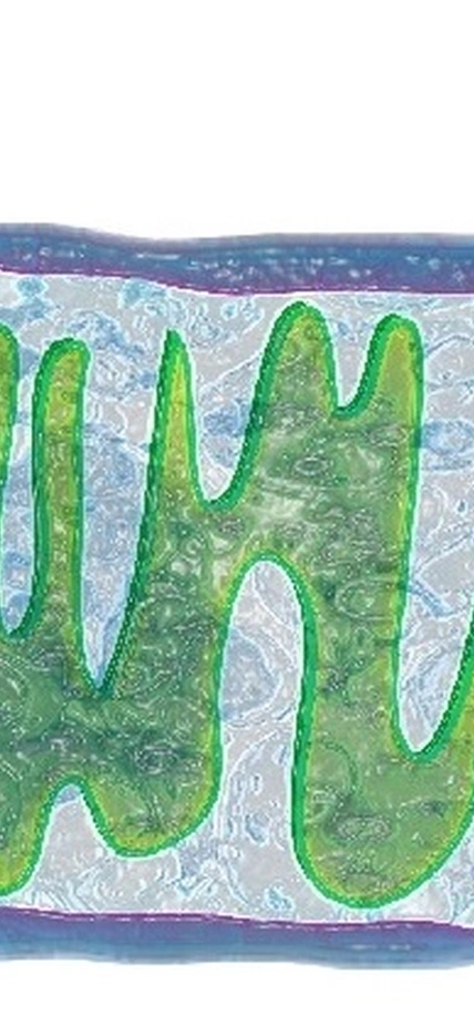 Top Image Caption: Artist’s depiction of mitochondria, courtesy of Matthew Sieber. The purple on the outside border represents the outer mitochondrial membrane. The blue on the inside depicts the mitochondrial inner membrane space. The green and purple inside depicts the inner mitochondrial membrane and mitochondrial matrix.