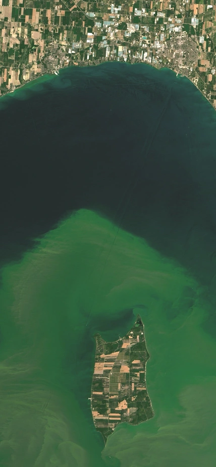 Top Image Caption: An image of the algal blooms in Lake Erie taken in July 2015. NASA Earth Observatory images by Joshua Stevens, using Landsat data from the U.S. Geological Survey.
