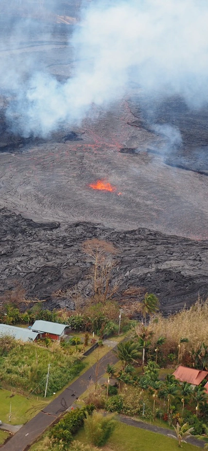 Top Image Caption: In May 2018, eruptive fissures opened and deposited lava within the Leilani Estates subdivision on the Island of Hawaii. Over 700 homes were destroyed, displacing more than 2,000 people. (Credit: B. Shiro, USGS)