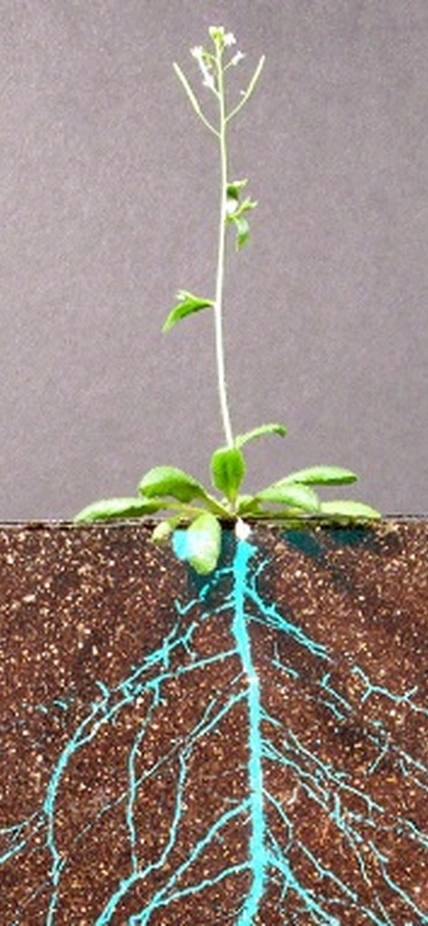 Image Caption: This is a composite image of a growing experimental mustard plant, Arabidopsis thaliana, along with a luminescence-based image of the root system of the same plant. Image is courtesy of Rubén Réllan-Álvarez.