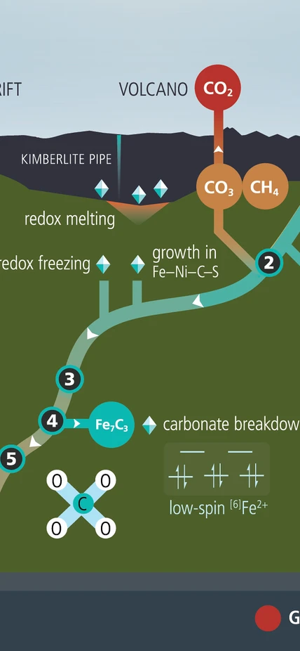 A simplified diagram of the reactions that occur during the deep-Earth carbon cycle. Image credit: Deep Carbon Observatory