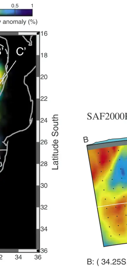 Seismic velocities beneath southern Africa. Blue colors denote high seismic velocities indicative of cold temperatures whereas red is lower velocity, higher temperature, material. The coldest regions, extending to 200-300 km depth in the cross section on the right are centered beneath the oldest crustal section in this area, the Kaapvaal Craton that dates back to 3.6 billion years. Figures from James et al., G3, 2004.