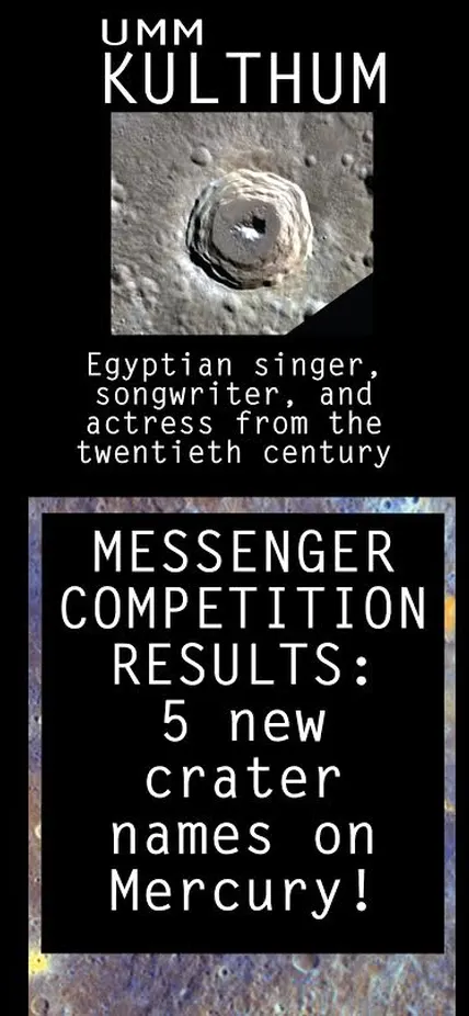 Washington, D.C—The MESSENGER Education and Public Outreach (EPO) Team, coordinated through Carnegie Science, announces the winning names from its competition to name five impact craters on Mercury. The contest submissions had to be submitted by January 15, 2015, and the International Astronomical Union (IAU)—the governing body of planetary and satellite nomenclature since 1919—made the selections from a semi-final submission of 17 artists’ names. The newly selected crater names are Carolan, Enheduanna, Karsh, Kulthum, and Rivera.