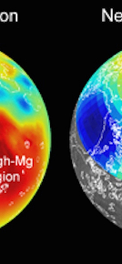 Image Caption: Maps of magnesium/silicon (left) and thermal neutron absorption (right) across Mercury’s surface (red indicates high values, blue low). These maps, together with maps of other elemental abundances, reveal the presence of distinct geochemical terranes. Volcanic smooth plains deposits are outlined in white.