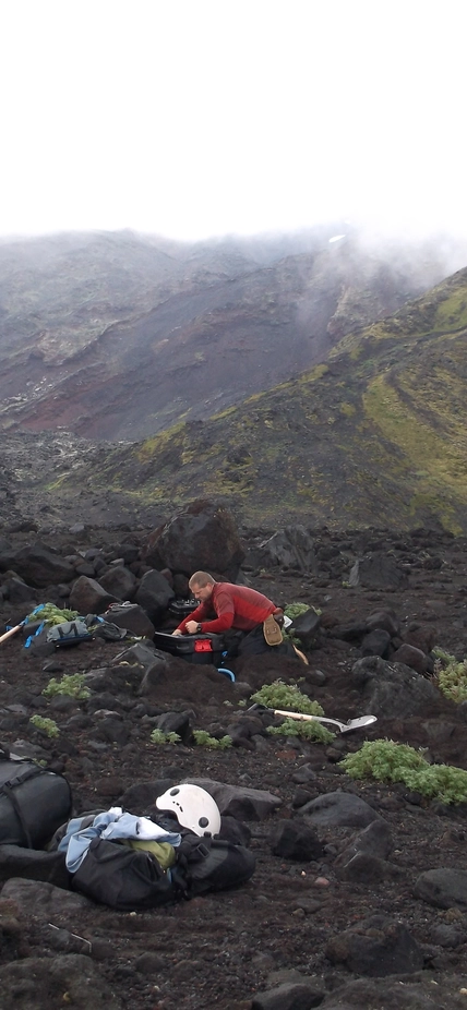 Caption: EPL Staff Scientist Diana Roman collecting samples from Cleveland Volcano, with Tana Volcano on Chuginadak Island in the background in the Aleutian Island chain. Recent work shows that the Cleveland Volcano along with the Tana, Herbert, Carlisle Volcanoes could actually be part of a single, previously unrecognized giant volcano, or interconnected caldera, in the same category as Yellowstone, according to work from a research team, including Carnegie’s Diana Roman, Lara Wagner, and Hélène Le Mével, as well as recently departed postdocs Daniel Portner and Helen Janiszewski.