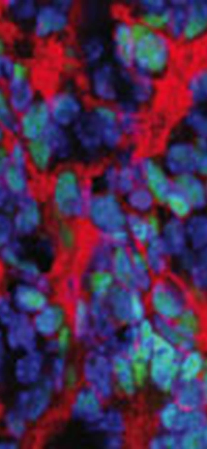 Image Caption: A close-up picture of retinoblastoma cells stained with two retinoblastoma markers, courtesy of David MacPherson.