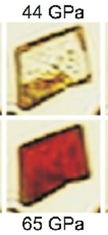 Top image caption: Siderite undergoing a spin transition at 44 gigapascals (434,000 times normal atmospheric pressure) as revealed by a visible color change that indicates the rearrangement of electrons.