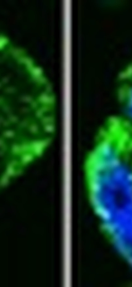 Image Caption: A non-catalytic subunit of the mRNA decapping complex (green), is found in both the cytoplasm and the nucleus (co-localizing with chromatin--blue) in embryonic stem cells.