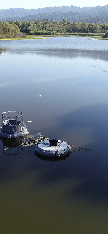Image Caption: Downwelling field experiment at Searsville Reservoir in Woodside, California, which shows the pipes through which oxygenated surface water is pumped into the depths to prevent the formation of dangerous, low-oxygen dead zones. Photos are courtesy of Nona Chiariello.