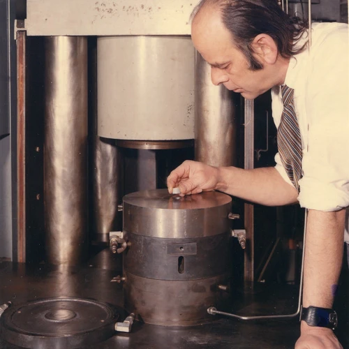 Geophysical Laboratory scientist Joe Boyd examines a sample in the Boyd-England press, which he developed with engineer Joseph England. This machine was the first to be able to consistently apply 40 kilobars of pressure—what materials experience in the deep crust and uppermost mantle. The press is still in use today.