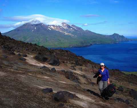 On the remote, eastern end of the Aleutian Arc in the northern Pacific Ocean are the Islands of Four Mountains. This chain comprises six tightly grouped volcanoes: Carlisle, Cleveland, Herbert, Kagamil, Tana, and Uliaga. Roman and her team—a powerhouse crew of several current and former Carnegie experts including Staff Scientists Lara Wagner and Hélène Le Mével, as well as then-postdocs Daniel Portner and Helen Janiszewski— were there to study Mount Cleveland.
