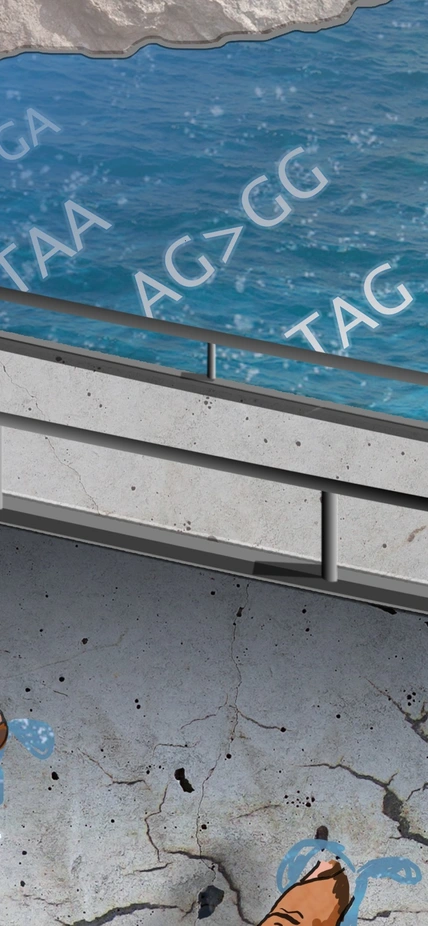 Top Image Caption: Adaptive mechanisms such as activation and use of cryptic splice sites or alternative transcription start sites as well as nonsense-associated alternative splicing and skipped exons maintaining reading frame shore up a sea of mutations expected to cause premature translation termination and loss of function. Artist: Neta Shwartz.
