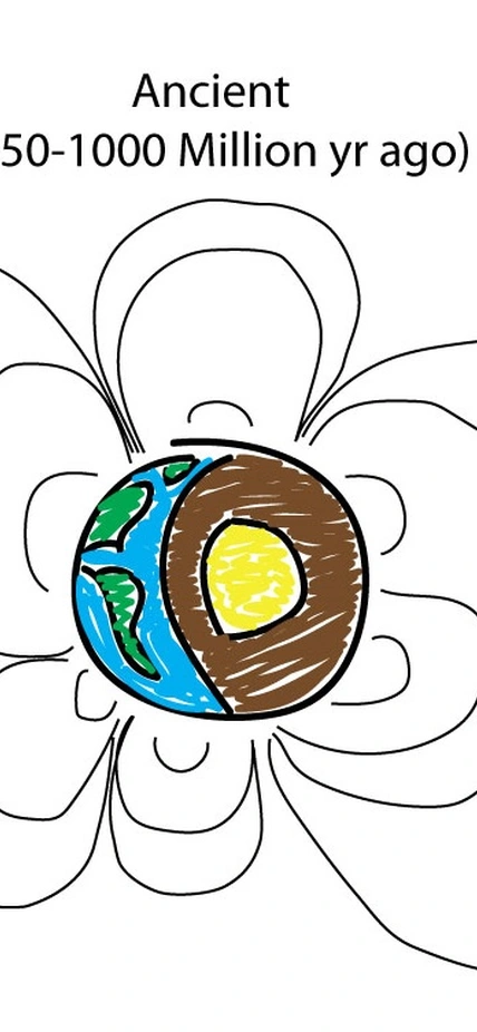 Caption: An illustration of ancient Earth's magnetic field compared to the modern magnetic field, courtesy of Peter Driscoll.