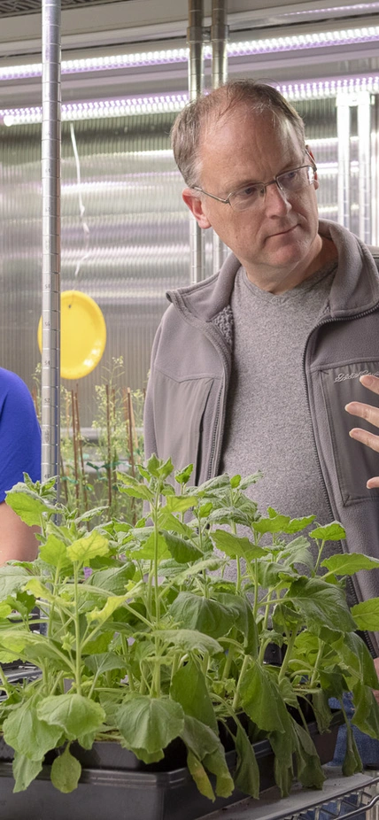 Caption: Sue Rhee, Thomas Clandinin and Miriam B. Goodman discuss the NeuroPlant project over a tobacco plant in the greenhouse. (Image credit: L.A. Cicero)