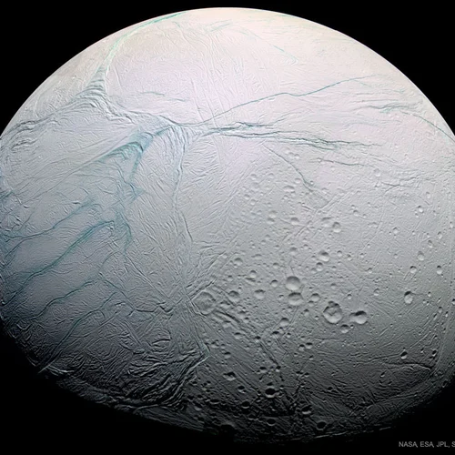An enhanced color image of the south pole of Saturn’s moon, Enceladus, with the five parallel fissures in the surface, named the Tiger Stripes, clearly visible. This image is a mosaic of 21 false-color frames taken during the Cassini spacecraft’s close fly-by mission on March 9 and July 14, 2005. Image credit: NASA/JPL/Space Science Institute